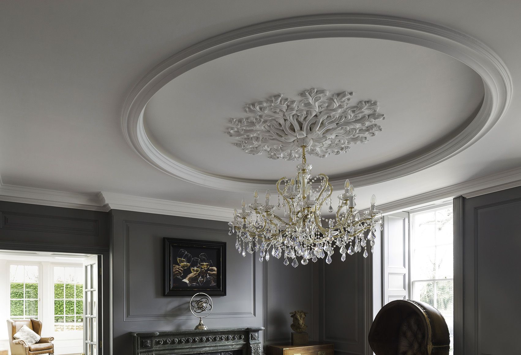 double-height kitchen ceiling, richly moulded cornices, wall panelling, backlit coffers, and large-scale